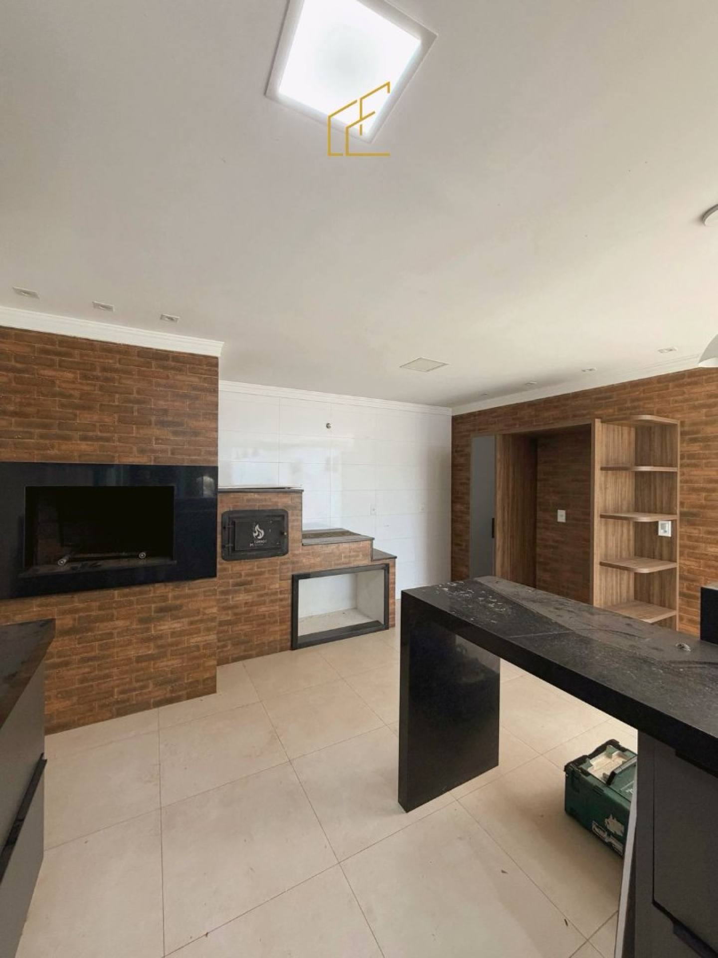 Área gourmet completa com fogão a lenha, churrasqueira, forno e fogão