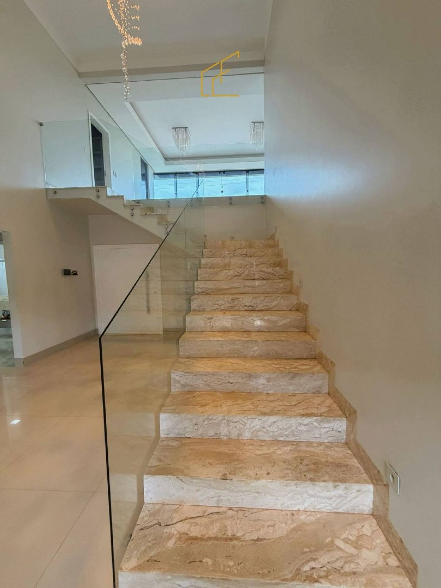 Escadaria em mármore com corrimão de vidro